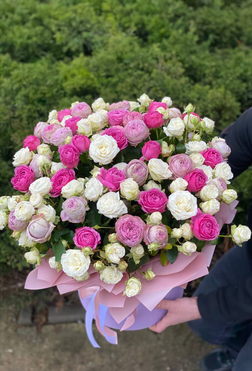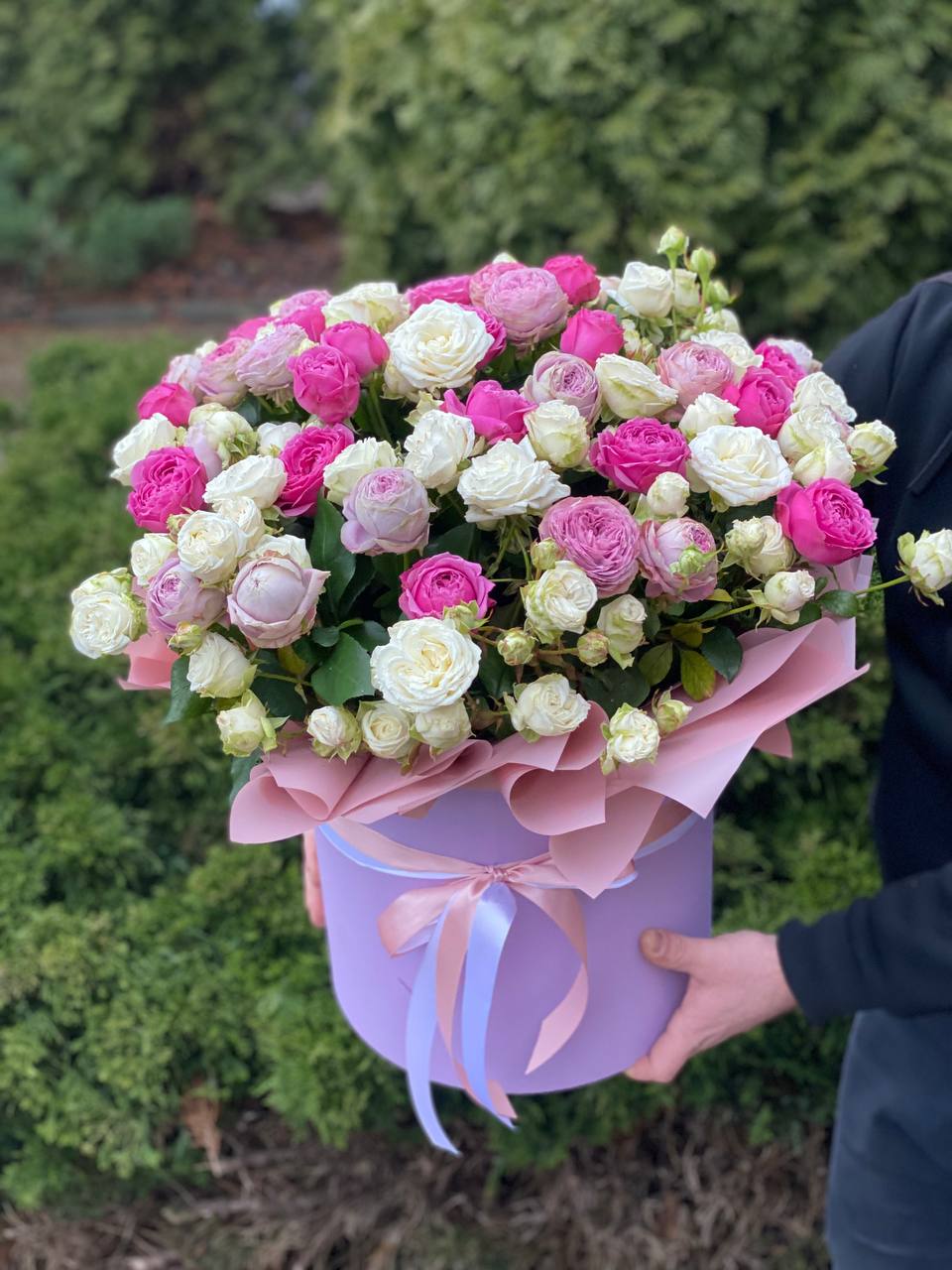 Шляпна коробка розмір XL 51 троянда (сорт Міс Бомбастік, Лавандерлейс та Лавандові)