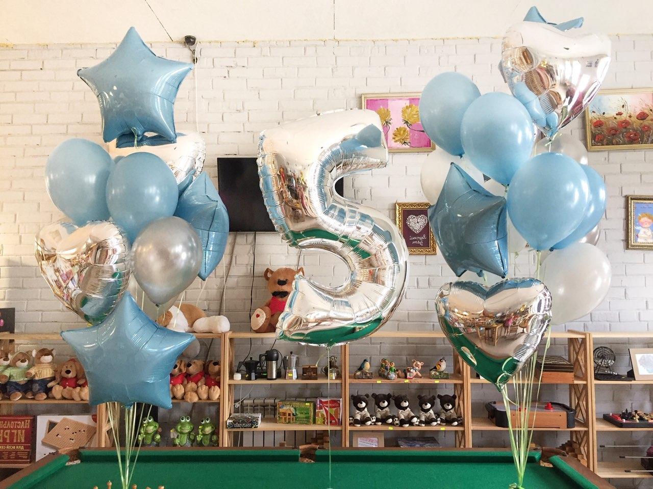 На выбор: цифра фольга серебро 100 см 1 шт, зірка фольги черная 5 шт, серьга фольги сірі 5 шт, шарики латексные 15 шт (блакитні та сірі) - из обработки Hi-float