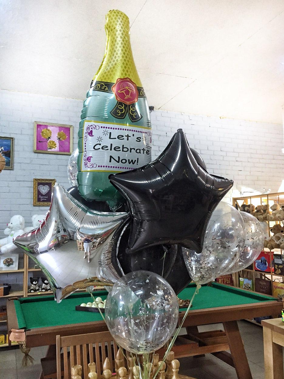 Набор: шампанское 1 шт, кондитерские изделия 3 шт, зірка фольги 2 шт (сірий та черный), латексный шарик 5 шт (черні) - Із обработка Hi-float