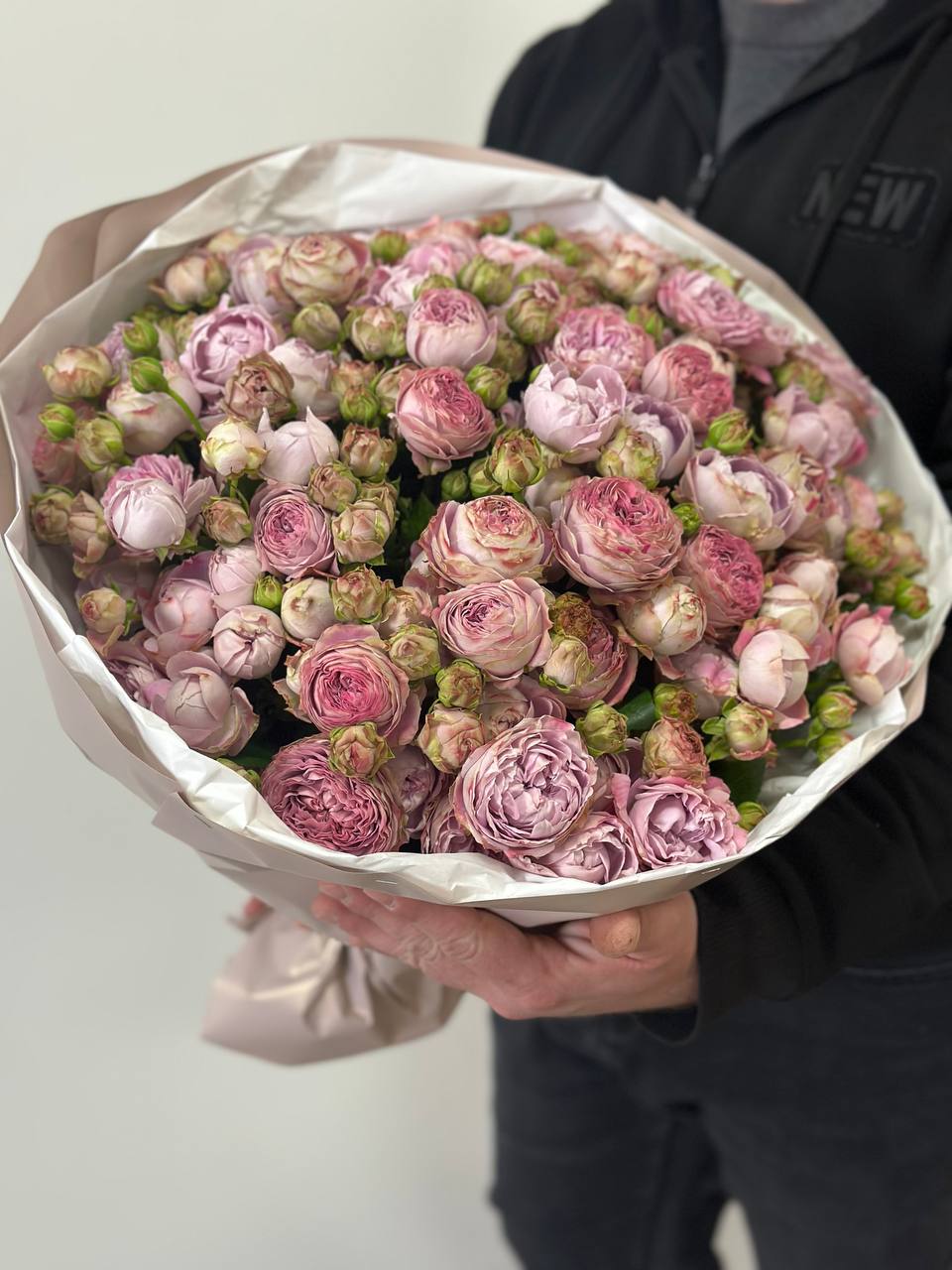 Этот букет из 39 пионовидных роз лавандовых оттенков — нежная, элегантная композиция, полная тонких цветовых переходов. Пастельные оттенки придают букету мягкий и романтичный характер — идеальный вариант для благодарственных писем, подарков на именины или украшения торжеств. Цветы собраны вручную, что обеспечивает пышные бутоны и красивый вид; упаковка сохраняет форму букета, обеспечивая его свежесть и долгое радующее глаз.