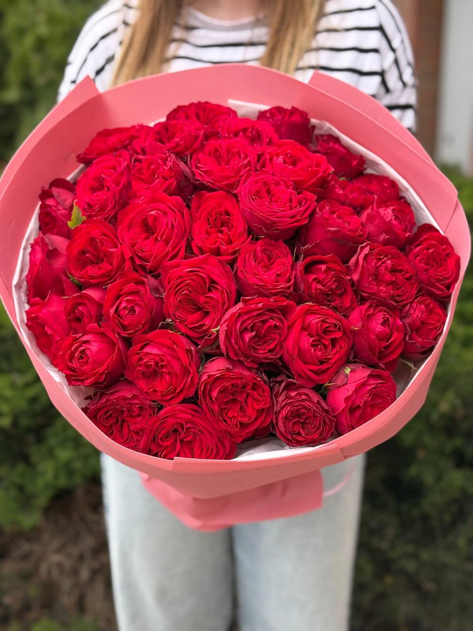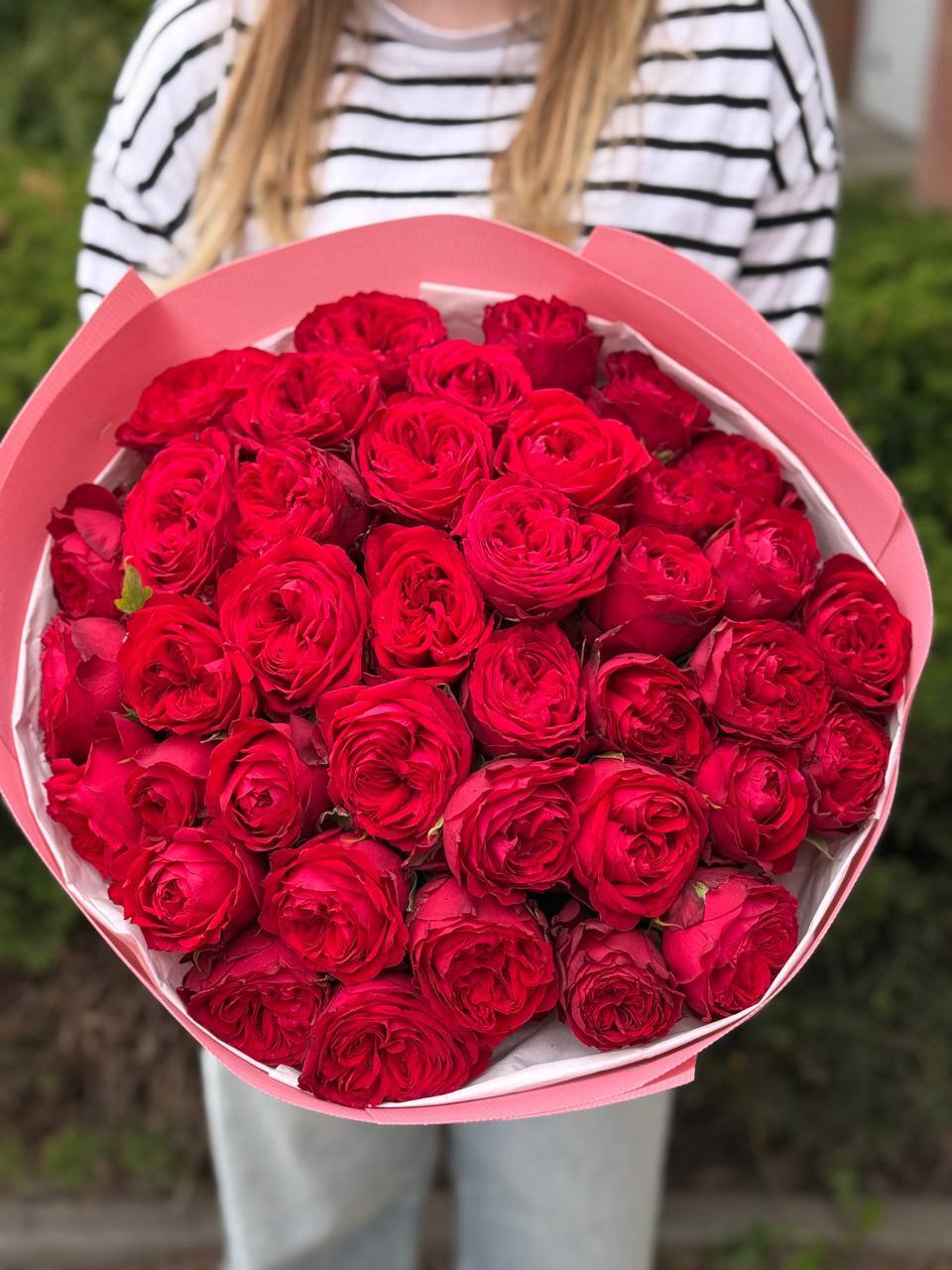 Букет из 39 пионовидных красных роз сорта «Кантри Спирит» глубокого, насыщенного цвета и пышной формы. Нежность бутонов и интенсивность оттенка создают одновременно эмоциональную и элегантную композицию. Идеальный выбор для романтических жестов, годовщин или особых торжеств. Букет собран вручную, тщательно упакован и надежно закреплен, чтобы гарантировать его доставку в идеальном состоянии.