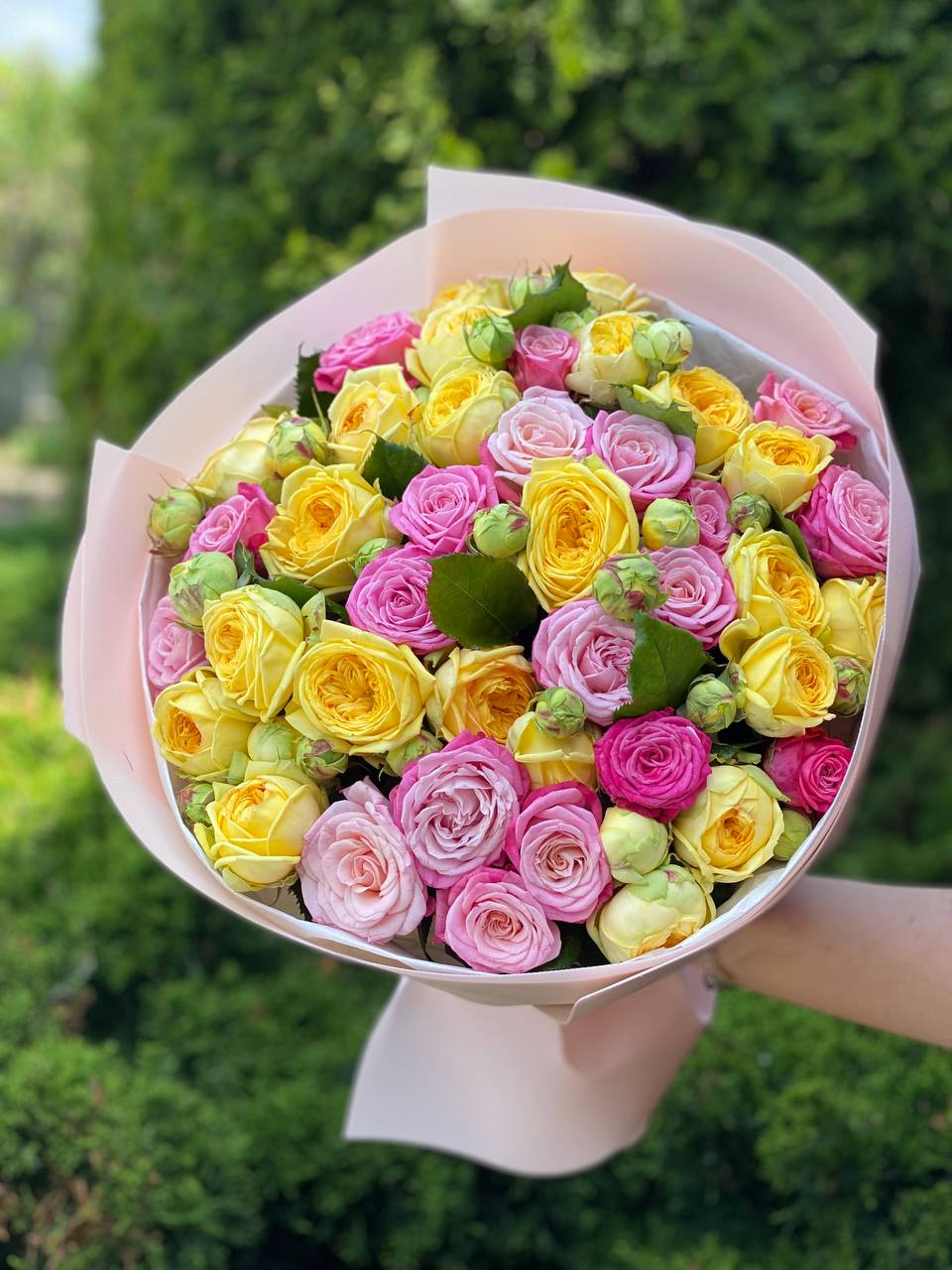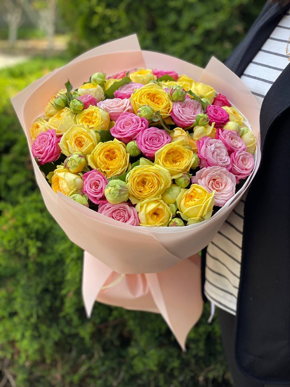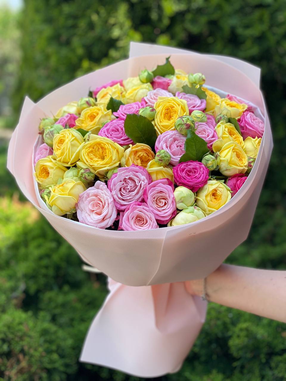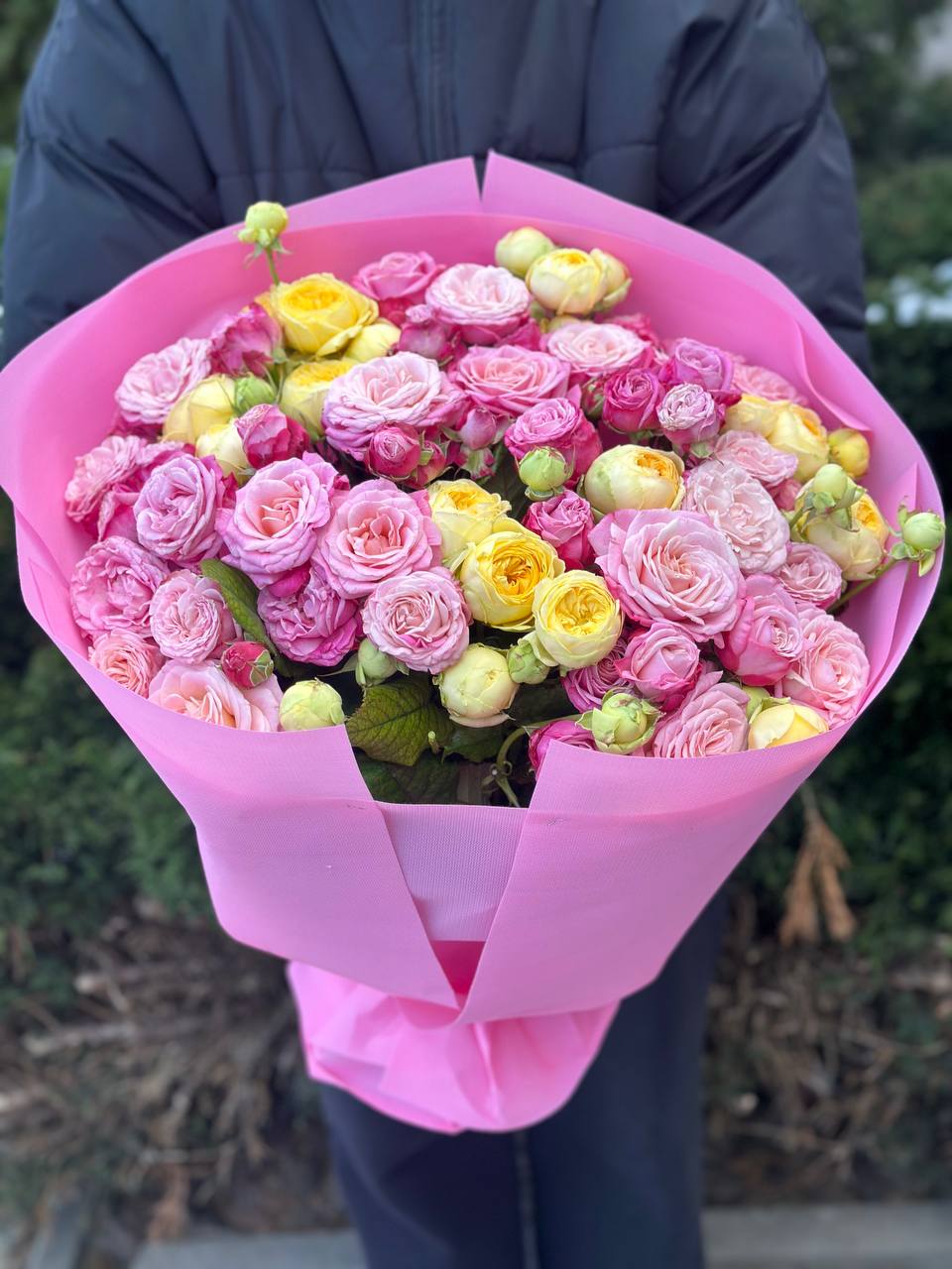 Изысканная композиция из 39 пионовидных роз сортов Pioni и Lady Bombastic создаёт букет с мягким, роскошным объёмом. Пастельные и насыщенные оттенки гармонично сочетаются, создавая композицию, подходящую для элегантных подарков и украшений. Букет собран вручную с особым вниманием к свежести и пропорциям; прочная упаковка гарантирует целостность букета и порадует с первого взгляда.